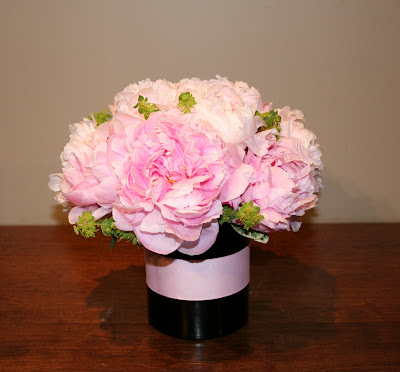 Who said peonies were only available in May? We get them imported from Holland - yes they are a bit more money than when they are local in May but these are worth every penny on top of a big acknowledgment from that special recipient. Here we sent a simple special arrangement of Sarah Bernhardt Peonies accented with Bupleurum in a gross grain ribbon accented black glass vase.