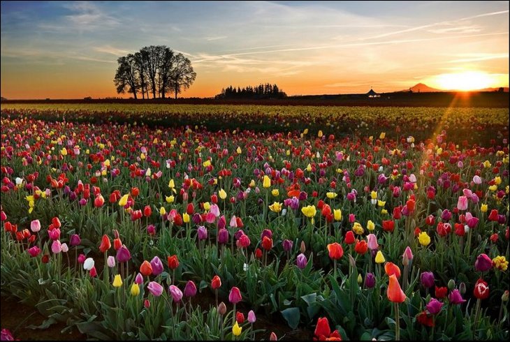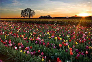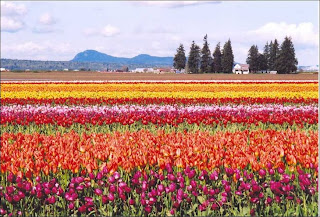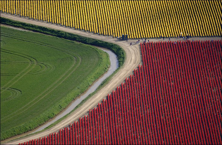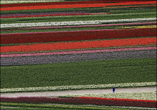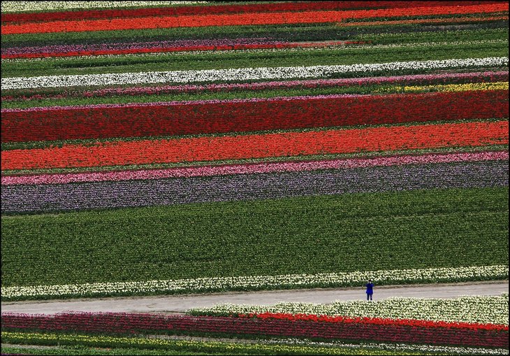 "At first glance, it looks like a giant child armed with a box of crayons has been set loose upon the landscape. Vivid stripes of purple, yellow, red, pink, orange and green make up a glorious Technicolor patchwork. Yet far from being a childs sketchbook, this is, in fact, the northern Netherlands in the middle of the tulip season!"