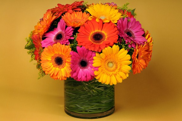 3. Wooster Street: Mixed colored gerbera with salidago in a clear cylinder vase!