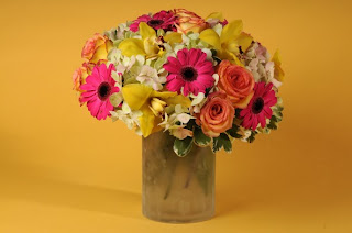 10. Bryant Park: Any fashion expert knows that summer is a time for bright colors. A mixed arrangement of hydrangea, yellow cymbidium, yellow and peach roses with hot pink gerbera in a frosted cylinder vase.