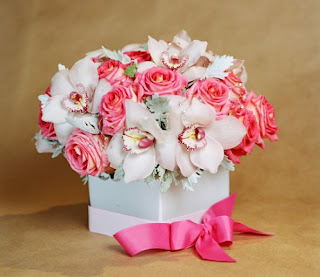 19. Pink Diamond: Roses bloom all summer in Manhattan. Pink roses and cymbidium orchids accented with sparkling “diamonds”.