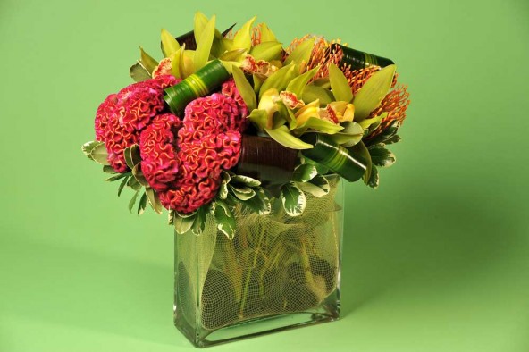 7. NoHo: A fun summer arrangement of cymbidiums, protea and celosia.