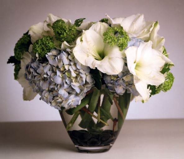 21. Soho: Like a day at the lake. Stylish arrangement of mont blanc amaryllis, powder blue hydrangea and accented with green viburnum blossoms.