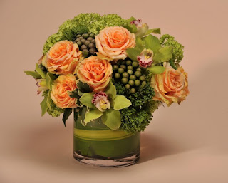 21. Sutton: Peach roses with green viburnum, cymbidium orchids and brunia.