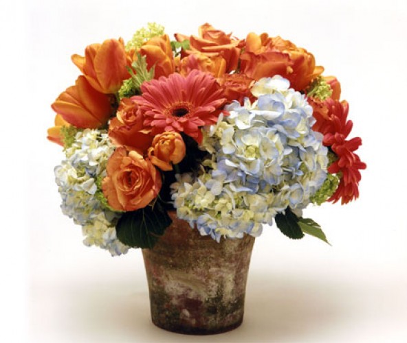 4. Tudor City: Weathered terra cotta pot topped with blue hydrangeas, orange gerbera, roses and tulips in a bed of frog eyes foliage.