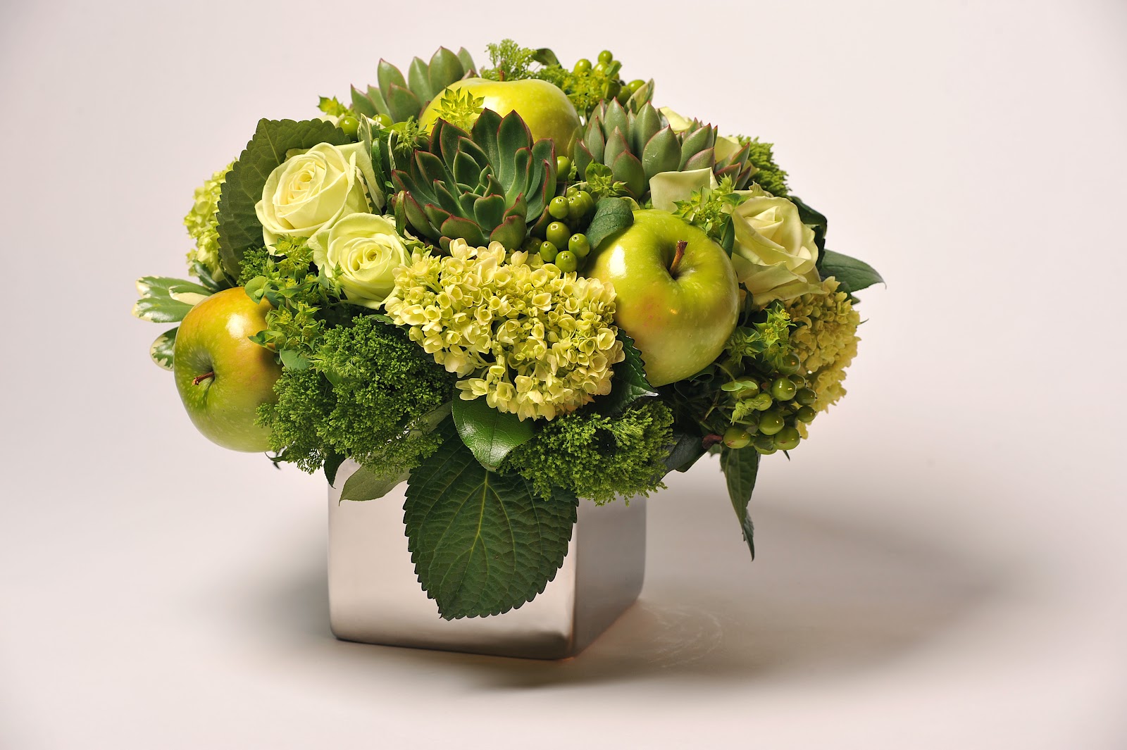 14. Green Street: The Big Apple can certainly be summary. A greenery styled arrangement filled with hydrangea, roses, echeveria and apples in silver vase.
