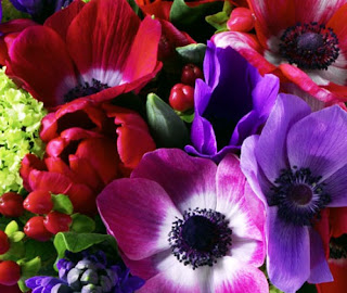6. Hell's Kitchen: If you've been to restaurant row as of late, you'll know where the inspiration for this came from. A bright exciting mix of red, orange and gold flowers in a chic smoked glass half moon vase.