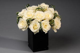 18. Upper East Side: A beautiful traditional style of white hydrangea, amaryllis, cymbidium orchids, mint green roses accented with hypericum in a cube vase.