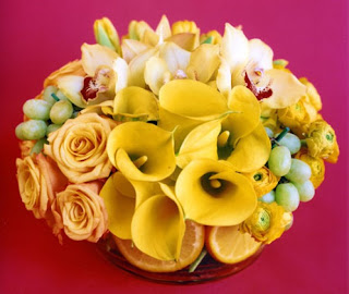 20. Union Square: Like fresh squeezed lemonade. Nuveau glass vase lined with orange wedges filled with clustered callalilies, roses, orchids and grapes.