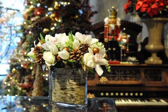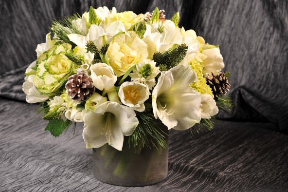 4. White Christmas - Christmas Eve dinner party? Want to impress your friends and family? This classic, beautiful piece speaks to our love of Christmas and the holiday season here in Manhattan. One of our favorite arrangements with white cymbidiums, white tulips, white roses, white lilacs, and pine cones, lined with birch bark! Makes us want to drink some spiced apple cider and sing Christmas carols!