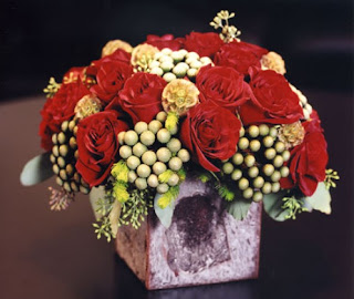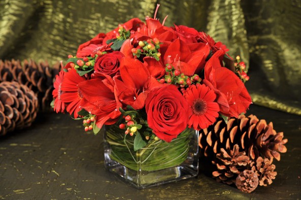 8. Christmas in New York - A festive mix of white amaryllis, res roses, red gerbera, red hypericum, red rose, mini green hydrangea and pine cones! Another festive arrangement!