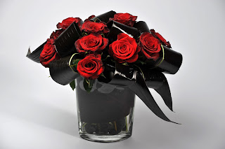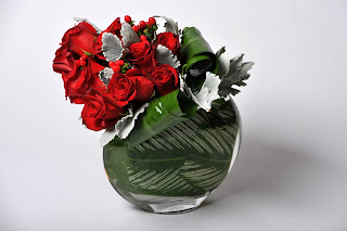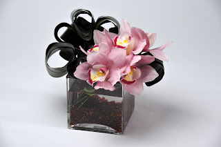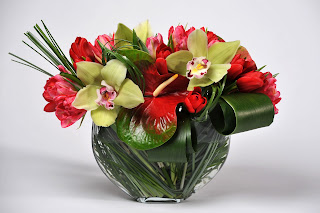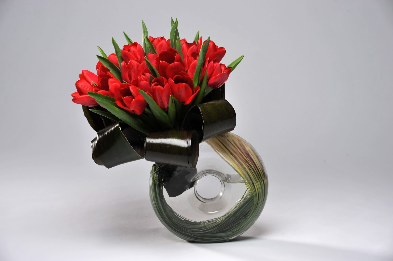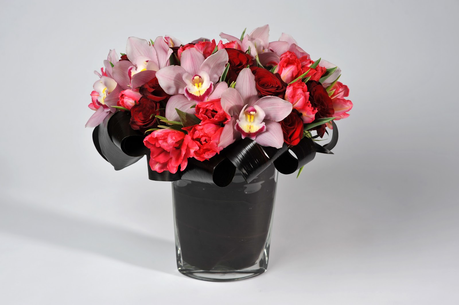 In these arrangements you'll find beautiful, unique vases, filled with red, pink & white roses, pink and purple tulips, cymbidium orchids, antheriums, and hyacinth, styled with black & green ti leaves, dusty miller, bear grass, and curly willow.
